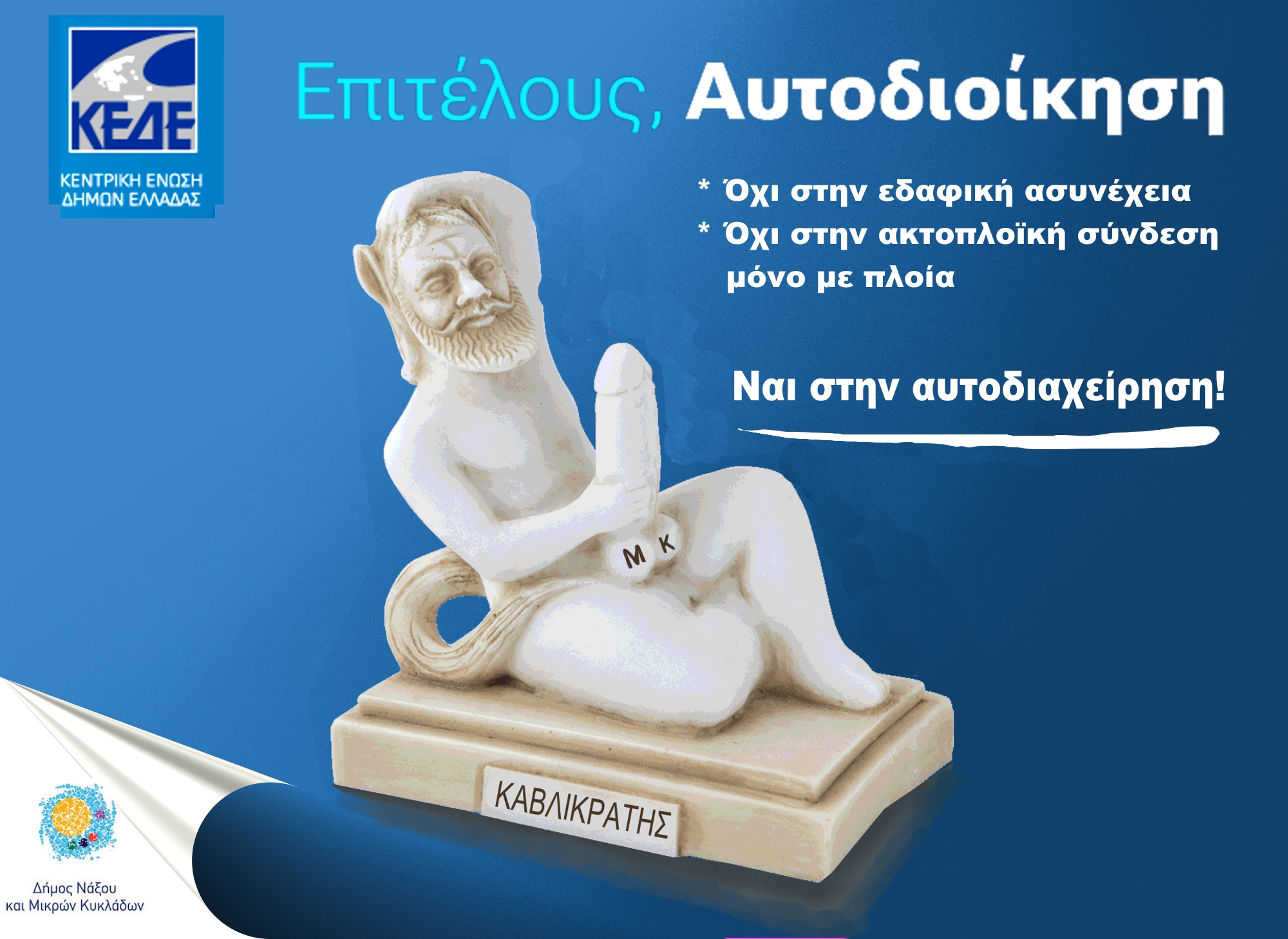 Εκείνη τη χρονιά στο καρναβάλι της Χώρας του 2010, είχε εμφανιστεί ένα άρμα με τον τίτλο «Καυλικράτης» όπου σε μορφή αγάλματος, ένας μικρός σε μέγεθος άνθρωπος κρατούσε τεράστιο πέος στους όρχεις του οποίου έγραφε μικρές Κυκλάδες!…  Δεκαπέντε χρόνια αργότερα στο πρόσφατο δημοτικό συμβούλιο -ομόφωνα- καταγγέλθηκε πως ο Δήμος μας δεν έχει κανένα μέλλον!…