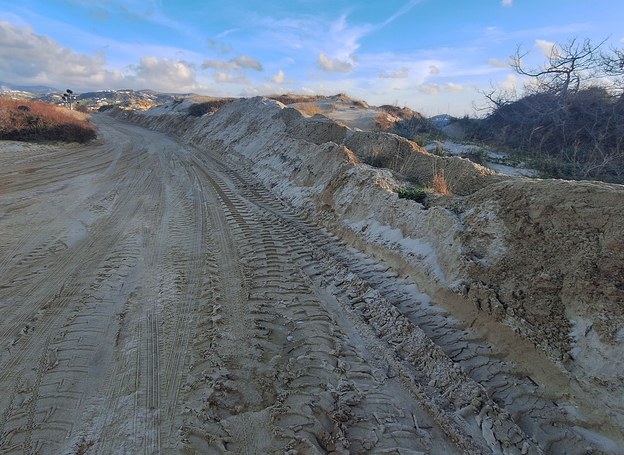 Της βλακείας που επί σειρά ετών, με αποκλειστικό σκοπό το κέρδος καταστρέφει το περιβάλλον ανοίγοντας δρόμους εκεί που δεν θα έπρεπε να υπάρχουν! Δρόμους που χρησιμοποιούν κατά κόρον βαρέα οχήματα, μπουλντόζες, λεωφορεία και φορτηγά! Φορτηγά που ακόμα και σήμερα, όπως βλέπετε στην παραπάνω φωτογραφία, καταστρέφουν αμμοθίνες και όλο το οικοσύστημα της Πλάκας για να κάνουν διαπλάτυνση των παράνομων αυτών δρόμων!…